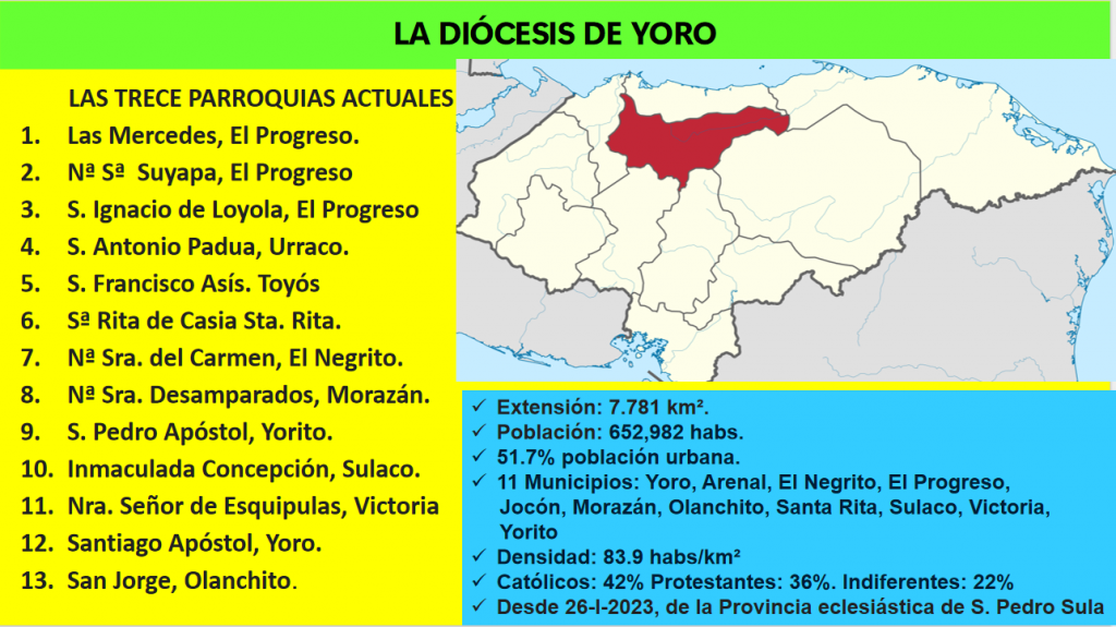 La Diócesis de Yoro, a lo largo de más de 80 años, se ha consolidado en tres etapas: la primera, cuando era Vicaria de Tegucigalpa (1946-2005) con los jesuitas estableciendo parroquias, templos, terrenos y obras sociales como el Instituto San José, el ERIC, el Teatro La Fragua, el Centro Loyola y el Centro de Espiritualidad de Agua Blanca; la segunda (2005-2014) con Monseñor Juan Luis Giasson consolidando la diócesis y formando agentes de pastoral; y la tercera (2014-2025) con Monseñor Héctor David García Osorio fortaleciendo formación, vocaciones, pastoral familiar y cuidado de la Casa Común. Las Mercedes de El Progreso fue elevada a Catedral, consolidando su rol central. Actualmente la diócesis cuenta con 13 parroquias activas en 11 municipios y ha desarrollado nueve prioridades pastorales en los últimos 20 años: La Misión, la Formación, las Vocaciones, la Pastoral Social, la Espiritualidad Encarnada, la Pastoral de Conjunto, la Casa Común, la Familia y la Liturgia y Celebración, fortaleciendo la identidad cristiana y la participación comunitaria. En conclusión, la Diócesis de Yoro ha logrado un desarrollo integral y sostenido, consolidando su misión evangelizadora, fortaleciendo sus estructuras eclesiales y sociales, y asegurando la continuidad de sus prioridades pastorales históricas hacia el futuro.