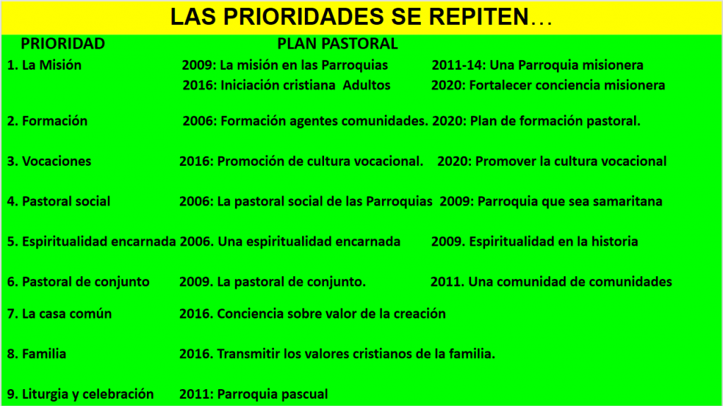- 2019–2024: (un Plan) Misión, formación, vocaciones, pastoral de conjunto, familia, liturgia y cuidado de la Casa Común. Estas prioridades han asegurado continuidad, consolidación y capacidad de respuesta frente a los desafíos pastorales.